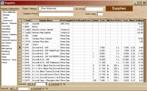 The Supplies module organizes the business into categories. The program starts with a supplies database of over 200 items that can be changed or removed. |